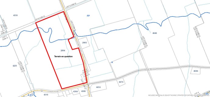 La proposition de modification au règlement de zonage affecte le terrain décrit comme partie du lot 6, concession 13, ancien Plantagenet Sud entourant le numéro civique 2894 chemin de comté 9 comme démontré sur la carte d’emplacement ci-dessous. Le site en question est désigné ‘’secteur des politiques agricoles’’ au Plan officiel des Comtés unis de Prescott et Russell.